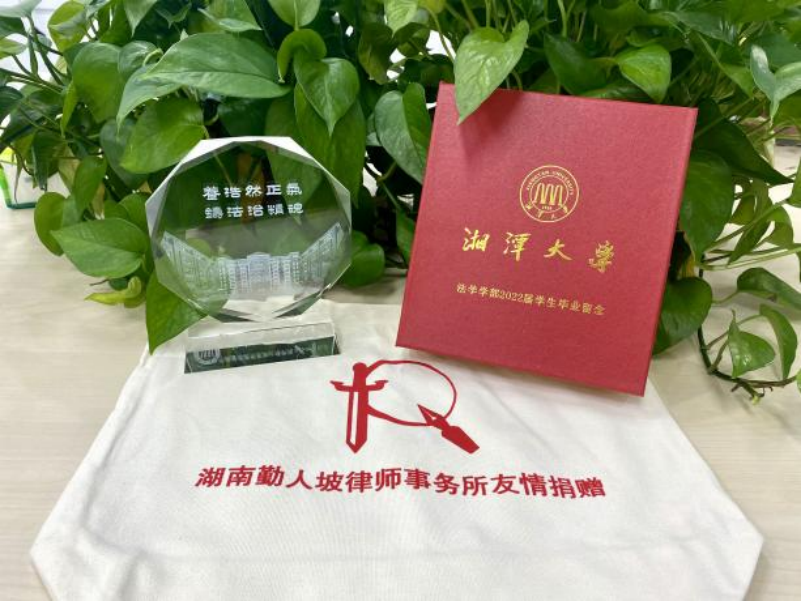 勤人坡律师事务所去年向我院捐赠了700套2021届毕业生纪念品,今年继续捐赠2022届毕业生纪念品750套。本次纪念品为水晶摆件和帆布袋,水晶摆件上印有雄伟大气的法学楼和“养浩然正气,铸法治精魂”的院训,帆布袋印有校徽和“新葡萄8883官网AMG2022届学生毕业留念”等字样。这份具有特殊意义的毕业纪念品承载着母院对毕业生们的祝福与希冀,将陪伴着毕业生们开启人生的新篇章,也时刻提醒着毕业生们秉持院训精神,做出湘大法律人的贡献。
