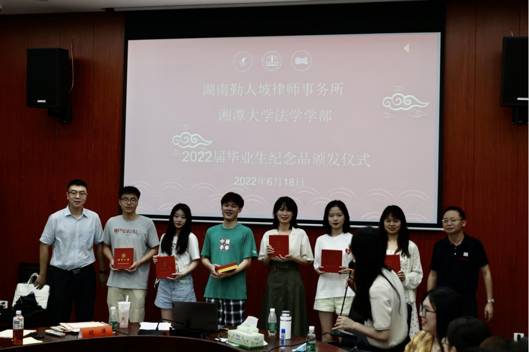2022年6月18日,湖南勤人坡律师事务所杨斯昂主任来到新葡萄8883官网AMG法学楼,与法学院党委黎益君副书记一起为新葡萄8883官网AMG2018级本科毕业生代表现场颁发了毕业生纪念品。