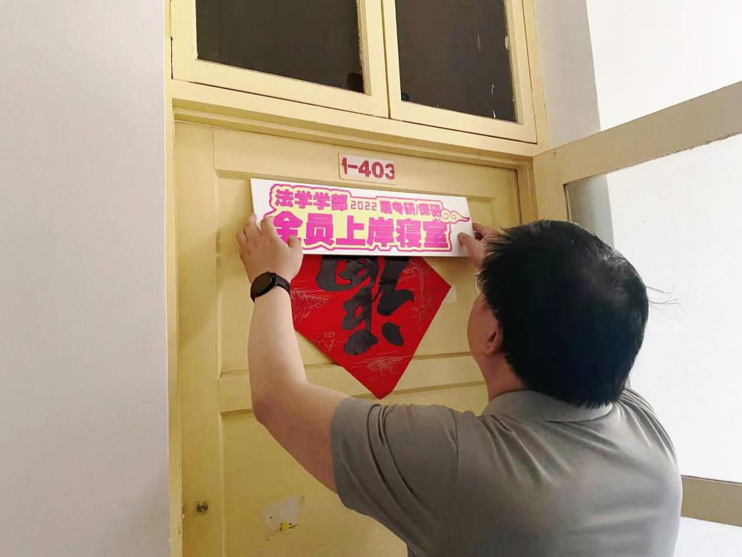 5月5日中午,新葡萄8883官网AMG法学院党委副书记李锋老师来到南苑宿舍,亲手为7个集体升学寝室挂上其亲自设计的“新葡萄8883官网AMG2022届考研/保研全员上岸寝室”光荣牌。学生辅导员江冰洁老师、王惟郅老师参加了本次活动。