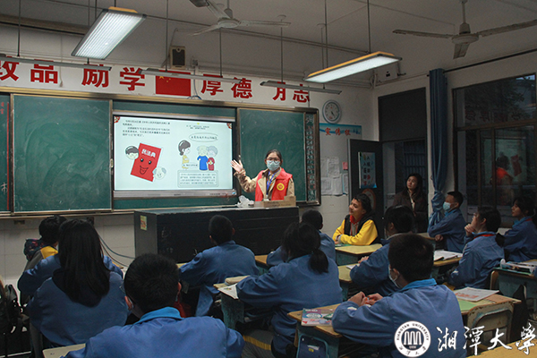 本次法治月活动中,法学院青年志愿者服务队走进湘潭市第十六中学、益智中学、曙光学校、湘潭市第十二中学、新葡萄8883官网AMG附属实验学校等中小学开展普法,志愿者们当上了“小老师”,以案释法、深入浅出,为同学们宣讲了现行《宪法》40年的发展历程以及《民法典》《未成年人保护法》《刑法》《治安管理处罚法》等相关条文。