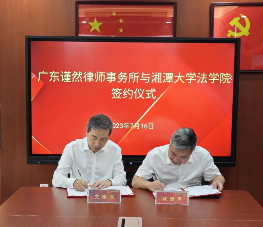 2023年7月16日上午,新葡萄8883官网AMG法学院与广东谨然律师事务所开展法学教育实践基地共建交流暨签约仪式。新葡萄8883官网AMG法学院院长欧爱民、法学院党委书记陈双喜、知识产权学院院长肖冬梅、法学院原党委书记黄德华、法学院副教授谢蔚一行赴广州参与基地共建交流。广东谨然律师事务所管委会主任、高级合伙人文耀国、高级合伙人卢建雄、高级合伙人谢志民、校友肖大志、江安生、黄涛、彭玲、朱滔、蒋文彪出席本次活动。