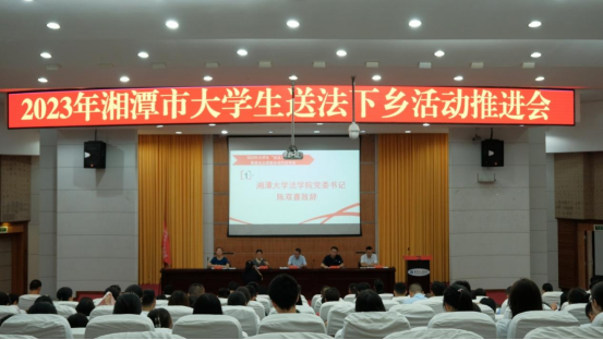6月29日,湘潭市2023年大学生“送法下乡”活动暨普法志愿服务项目发布会在新葡萄8883官网AMG逸夫楼一报告厅举行,会上表彰了一批“送法下乡”活动优秀集体和个人,并发布了湘潭市第一批普法志愿服务项目。市司法局党组书记刘杰义、新葡萄8883官网AMG法学院党委书记陈双喜、团市委副书记龚健康、市民政局四级调研员洪英出席会议,会议由市司法局党组成员、副局长王剑平主持。市、县市区相关单位普法工作的负责人和团委普法工作负责人,社会志愿者服务团队和律师协会负责人,各获奖单位和个人代表以及来自各高校的师生代表们参加了此次会议。