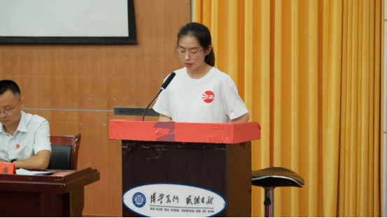 我院2021级李步云法学卓越班杨雅均同学作为学生志愿者代表上台发言。她表示:“青年一代是普法志愿服务的生力军,在普法实践之中,我们应充分发挥自己的专业特长,以小我的实践融入法治建设的大潮,让法治的种子在人民群众心中落地生根。”