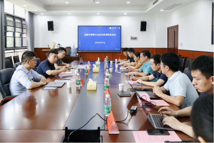 2023年6月25日,成都市蜀都公证处钟良主任一行莅临我院开展调研与合作洽谈。此次调研由钟良主任带队,同行人员有蜀都公证处主任助理昌雄飞、樊俊怀。本次座谈会在法学院204会议室举行,由新葡萄8883官网AMG法学院廖永安教授主持,法学院副院长李喜莲教授、谢蔚副教授、段明副教授、夏先华博士、张红旺博士、刘浅哲博士等参与了本次座谈。
