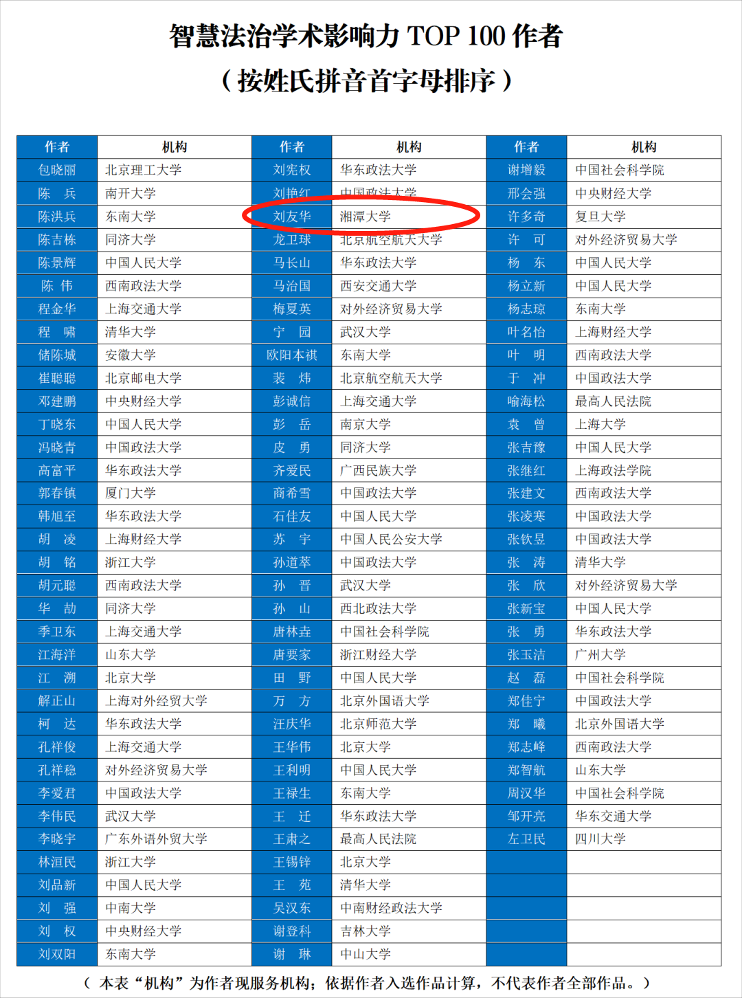 近日,“上海市法学会 东方法学”发布了由“智慧法治学术共同体”(AITEAM)和中国知网•中国科学文献计量评价研究中心联合推出的2023智慧法治学术影响力TOP100作者、作品,我院刘友华教授再次入选!刘友华教授曾于2021年入选《智慧法治学术影响力TOP100(2021)》智慧法治学术影响力 TOP100(作者)名单,位列第25位、智慧法治学术影响力 TOP100(作品)名单,位列第55位,并于2022年、2023年又连续入选榜单。自智慧法治学术影响力 TOP100榜单发布3年来,刘友华教授连续3年入选,展现了其在智慧法治研究领域的持续高产出和良好影响力。