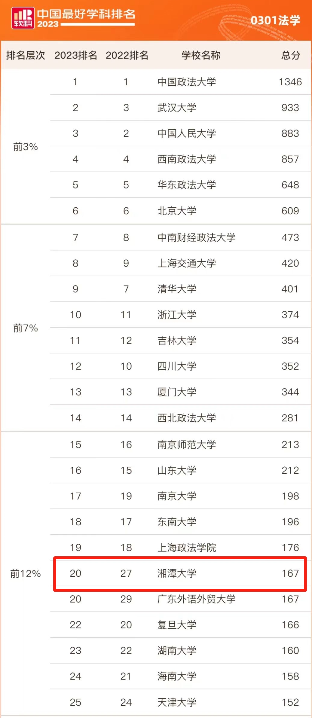 湘大法科进入全国前12%,位列全国第20名,较2022年提升7位。