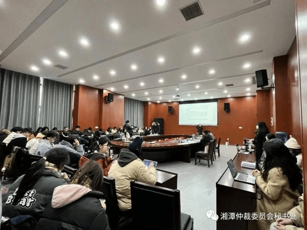 “湘潭仲裁委员会受理的罗某某与赵某、彭某某租赁合同纠纷一案,今天开庭……”2023年12月20日上午9点,仲裁员宣布开庭的声音在新葡萄8883官网AMG法学院一间会议室内响起。原来,这是一场仲裁案件的公开庭审现场,会议室内除了仲裁庭成员和双方当事人外,还围坐了几十名新葡萄8883官网AMG法学院的在读研究生。
