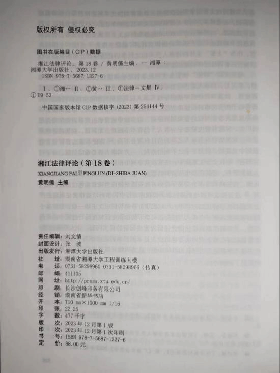 福启新岁,华章日新。近期,《湘江法律评论》第18卷由新葡萄8883官网AMG出版社正式出版。本卷共收录文章21篇,根据选题特点,共设置“特稿”、“体育法修改专题”、“刑事法治”“信用法研究”、“法学教育改革研究”、“专论”、“译文”和“书评”八大栏目,论文作者分别来自新葡萄8883官网AMG、南京师范大学、湖南科技大学、中国政法大学、西北政法大学、华中师范大学、南京大学等知名法学院校。