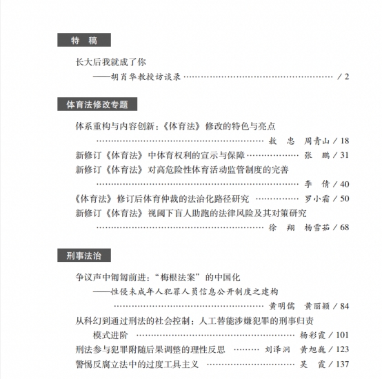 本卷“体育法修改专题”共收录五篇文章,主要对修订后的《体育法》进行论述。《体育法》作为我国体育领域的基础性法律,奠定了我国体育法治建设的制度根基,自颁布以来,为促进我国体育发展事业、增强人民体质发挥了重要作用。尽管《体育法》已经历两次修订,但整体上仍滞后于经济社会新发展阶段,不能完全适应新时代体育改革发展的战略定位,与人民群众日益增长的美好生活需要特别是对体育的需要还存在差距。在此背景下,我国第三次对《体育法》予以全面修订。《体育重构与内容创新:<体育法>修改的特色与亮点》一文从指导思想、章节体系、内容创新三方面对《体育法》修改的特色与亮点进行论述。《新修订<体育法>中体育权利的宣誓与保障》一文为落实《体育法》明确宣示的体育权利提供了相应建议。《新修订<体育法>对高危性体育活动监管制度的完善》一文立意新颖,从监管主体、监管范围、监管内容、监管标准四方面提出高危险性体育活动监管制度的完善建议。《<体育法>修订后体育仲裁的法治化路径研究》一文对体育仲裁法治化路径展开研究,在保证体育仲裁公正的基础上,提出了优化体育仲裁效率的方法。《新修订<体育法>视阈下盲人助跑的法律风险及对策研究》聚焦于残疾人等弱势群体的各项权利保障,通过调研“盲人助跑”活动,并结合文献分析、案例分析等研究方法,针对“盲人助跑”中存在的问题,提出解决对策,以维系“盲人助跑”活动中各主体的权利平衡。