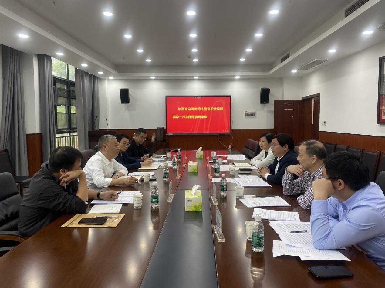 刘最跃书记感谢学部的热情接待,并简要介绍了湖南司法警官职业学院人才培养方案,并表明希望充分发挥双方职能优势,强强联合、资源互补,共同推动 双方在法学、司法实务以及相关领域的合作,推动双方学科建设和人才培养合作。