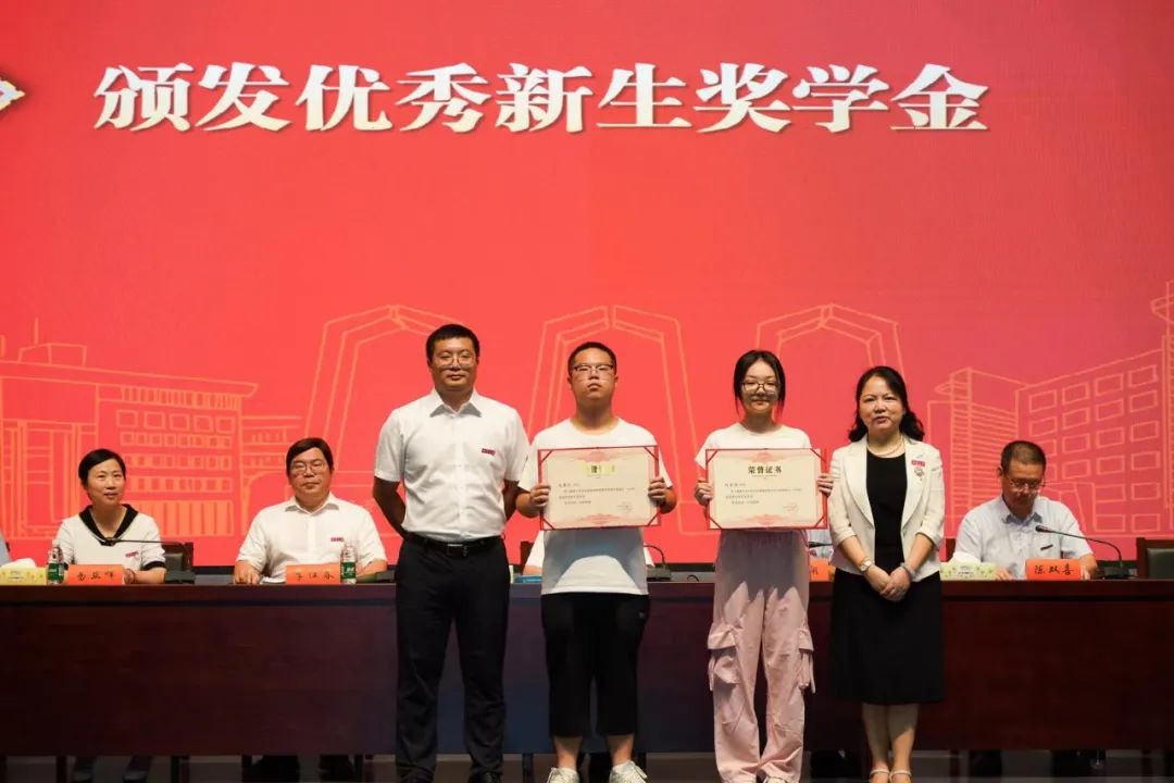 上午9时,开学典礼在雄壮的国歌声中拉开帷幕。黎益君副书记宣读《新葡萄8883官网AMG关于表彰优秀新生奖学金获得者的决定》,连光阳、尹湘南为获得“优秀新生奖学金”的刘承明、高慕仪同学颁奖。
