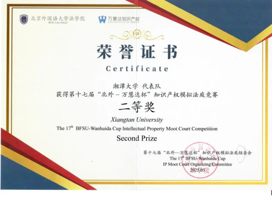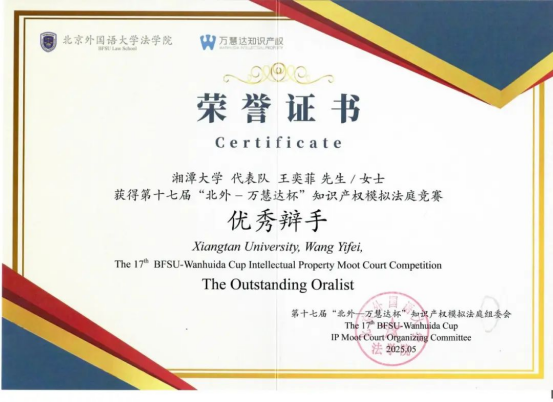 2025年5月23日至25日,第十七届“北外·万慧达杯”知识产权英文模拟法庭竞赛在北京顺利举行,中国政法大学、华东政法大学、西南政法大学、中国社会科学院大学、北京大学国际法学院、新葡萄8883官网AMG等18支国内知名法学院校代表队以及来自世界各大洲的5支高校代表队参加了本次比赛。最终,肯尼亚斯特拉斯莫尔大学代表队获得冠军,北京理工大学代表队获亚军,中国政法大学代表队和同济大学代表队获季军。新葡萄8883官网AMG代表队在23支队伍中排名第七,获得二等奖,队员王奕菲获得优秀辩手个人奖项。