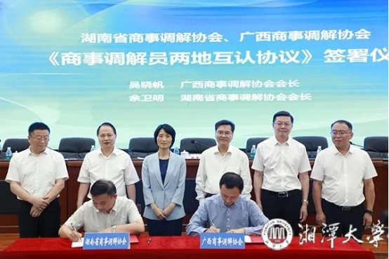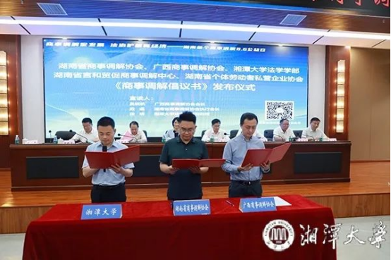 会上,湖南省贸促会党组书记、会长杨爱云与我校校长廖永安教授共同签署《战略合作协议》,中国贸促会湖南调解中心副秘书长蒋文娟、湘潭市中级人民法院副院长肖瑞芬、湘潭市贸促会副会长罗敏共同签署《关于推进商事纠纷诉调对接工作的合作备忘录》,湖南省商事调解协会会长余卫民与广西商事调解协会会长吴晓帆共同签署《商事调解员两地互认协议》;湖南省商事调解协会、广西商事调解协会、我校新葡萄8883官网AMG、湖南省言和贸促商事调解中心、湖南省个体劳动者私营企业协会共同发布《商事调解倡议书》,广西商事调解协会会长吴晓帆、湖南省商事调解协会执行会长段彧、新葡萄8883官网AMG副教授段明共同宣读倡议书。