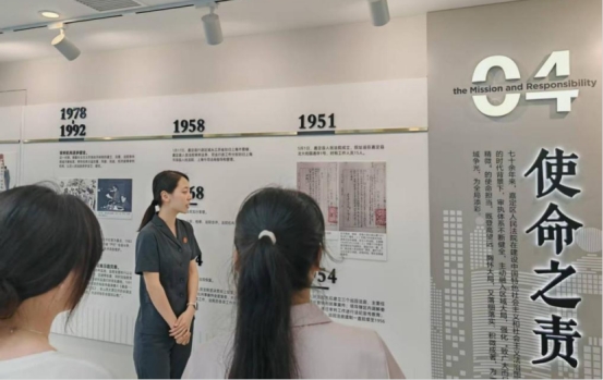 为帮助学子们深入了解法院历史与文化底蕴,嘉定区人民法院精心安排了院史馆参观活动。在法院政治部霍姝言老师的生动讲解下,同学们从全院干警题写的诗词切入,系统了解了嘉定区法院的历史沿革、发展成就及工作特色。讲解不仅展现了法院如何将“教化嘉定”深厚的历史底蕴融入现代司法实践,更让学子们深刻感受到了一代代嘉定法院人坚守初心、践行使命的精神传承。