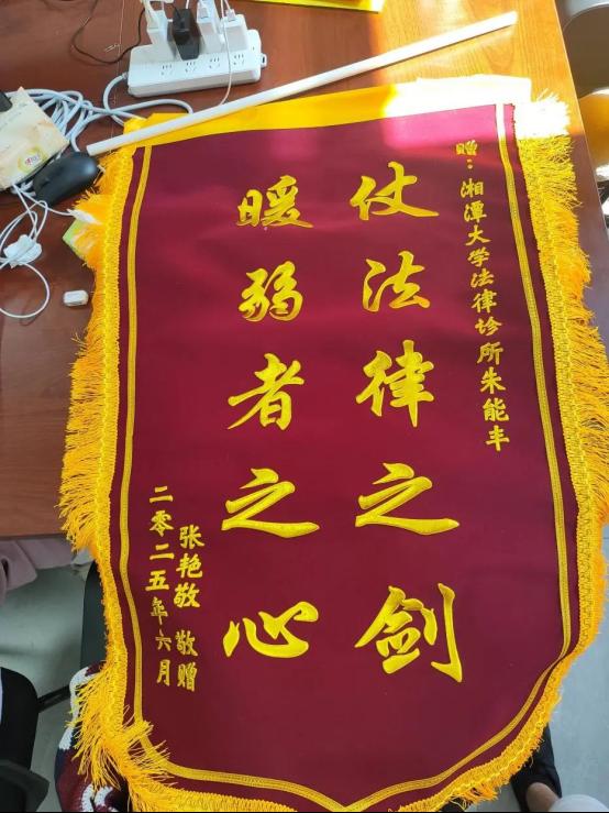 2025年7月24日,长沙市民张小姐向我校法律诊所办公室送达锦旗一面,以感谢我校法律诊所朱能丰同学在案件承办过程中的辛苦付出。