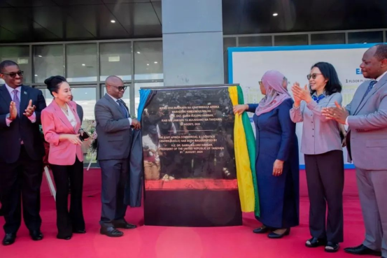 2025年8月1日,坦桑尼亚总统萨米娅·苏卢胡·哈桑在达累斯萨拉姆市为“东非商贸物流中心”(East Africa Commercial and Logistics Center, 简称EACLC)的开幕式剪彩。中国驻坦桑尼亚大使馆陈明健大使、坦桑尼亚总统府计划与投资部长姆昆博、外长孔博、桑给巴尔贸工部长沙班、达省省长查拉米拉等4000多人出席。