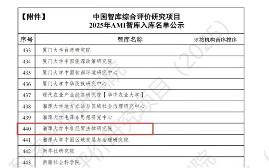 近日,中国社会科学评价研究院公示了“中国智库综合评价研究项目2025年AMI智库入库名单”,“新葡萄8883官网AMG中非经贸法律研究院”智库成功入选。此次入选,是对新葡萄8883官网AMG中非研究院智库整体建设工作的高度认可,并将为新葡萄8883官网AMG中非研究院在中非经贸法律研究及相关领域发挥更大作用提供更广阔的平台。