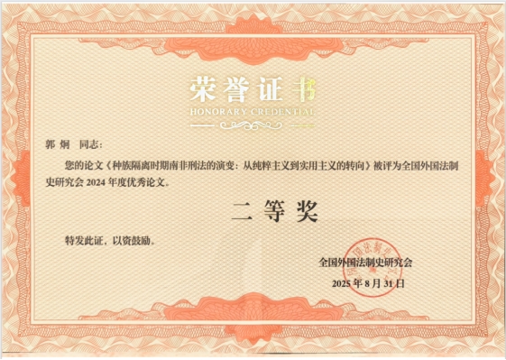 在闭幕式的首个环节——全国外国法制史研究会2024年度优秀论文颁奖典礼上,新葡萄8883官网AMG讲师郭炯的论文《种族隔离时期南非刑法的演变:从纯粹主义到实用主义的转向》获评全国外国法制史研究会2024年度优秀论文二等奖。