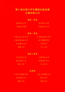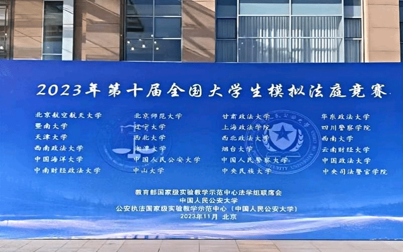 2023年11月11日至12日,第十届全国大学生模拟法庭竞赛在中国人民公安大学如期举行,中国政法大学、华东政法大学、西南政法大学、北京师范大学、中山大学、辽宁大学等24支高校代表队参加比赛。