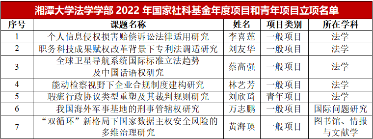 在七个立项课题中,湘大法科教师多管齐下,成效显著,其中,获批法学专业项目5项,分别是李喜莲教授的《个人信息侵权损害赔偿诉讼法律适用研究》、刘友华教授的《职务科技成果赋权改革背景下专利法调适研究》、蔡高强教授的《全球卫星导航系统国际标准立法趋势及中国话语权研究》、林艺芳副教授的《能动检察视野下企业合规制度建构研究》、刘欣琦博士的《瑕疵行政协议类型重塑及其裁判规则研究》。此外,获国际问题研究1项、图书情报专业项目1项,分别是万志鹏副教授的《我国海外军事基地的刑事管辖权研究》、黄海瑛副教授的《“双循环”新格局下国家数据主权安全风险的多维治理研究》。