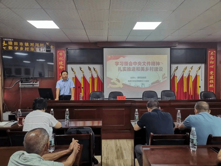 签约仪式后,法学院党委书记陈双喜和对河村第一书记樊军带领两个支部的参会党员同志共同开展主题党日活动,法学院教职工第二党支部书记蔡高强教授以《学习领会中央文件精神 扎实推进和美乡村建设》为题,给全体党员讲党课,与两个支部的党员同志一起学习了今年的中央一号文件,从推动乡村产业高质量发展、拓宽农民增收致富渠道、扎实推进宜居宜业和美乡村建设、健全党组织领导的乡村治理体系四个方面进行了重点解读,紧扣文件精神,为对河村发展提供可行性建议。