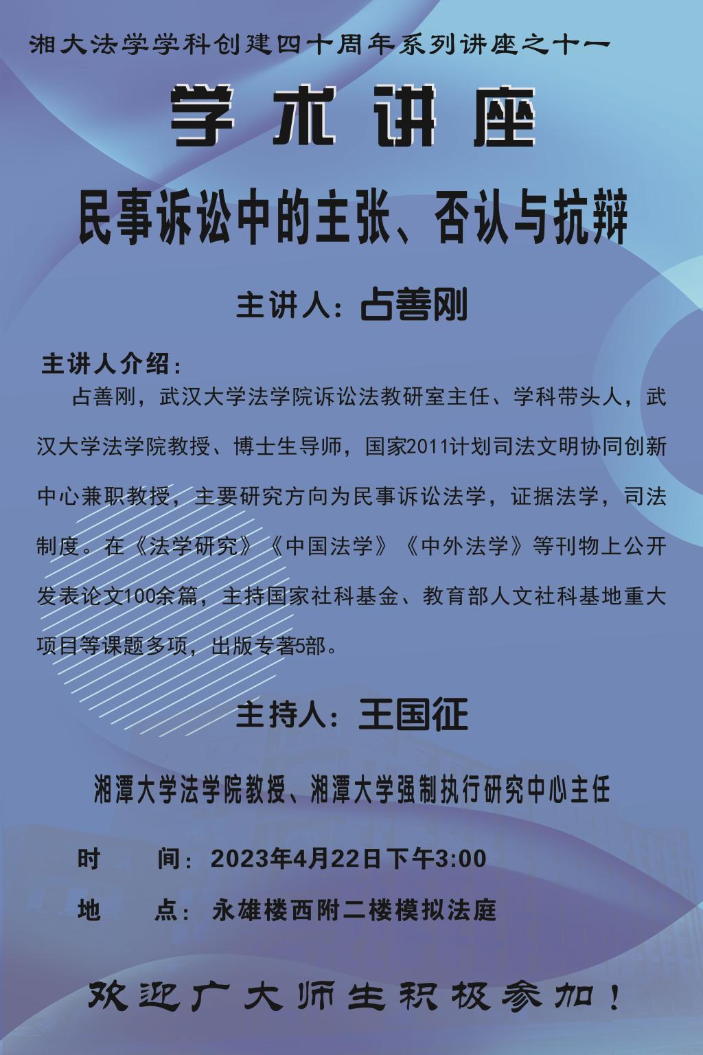 【湘大法学学科创建四十周年系列讲座之十一】占善刚:民事诉讼中的主张、否认与抗辩
