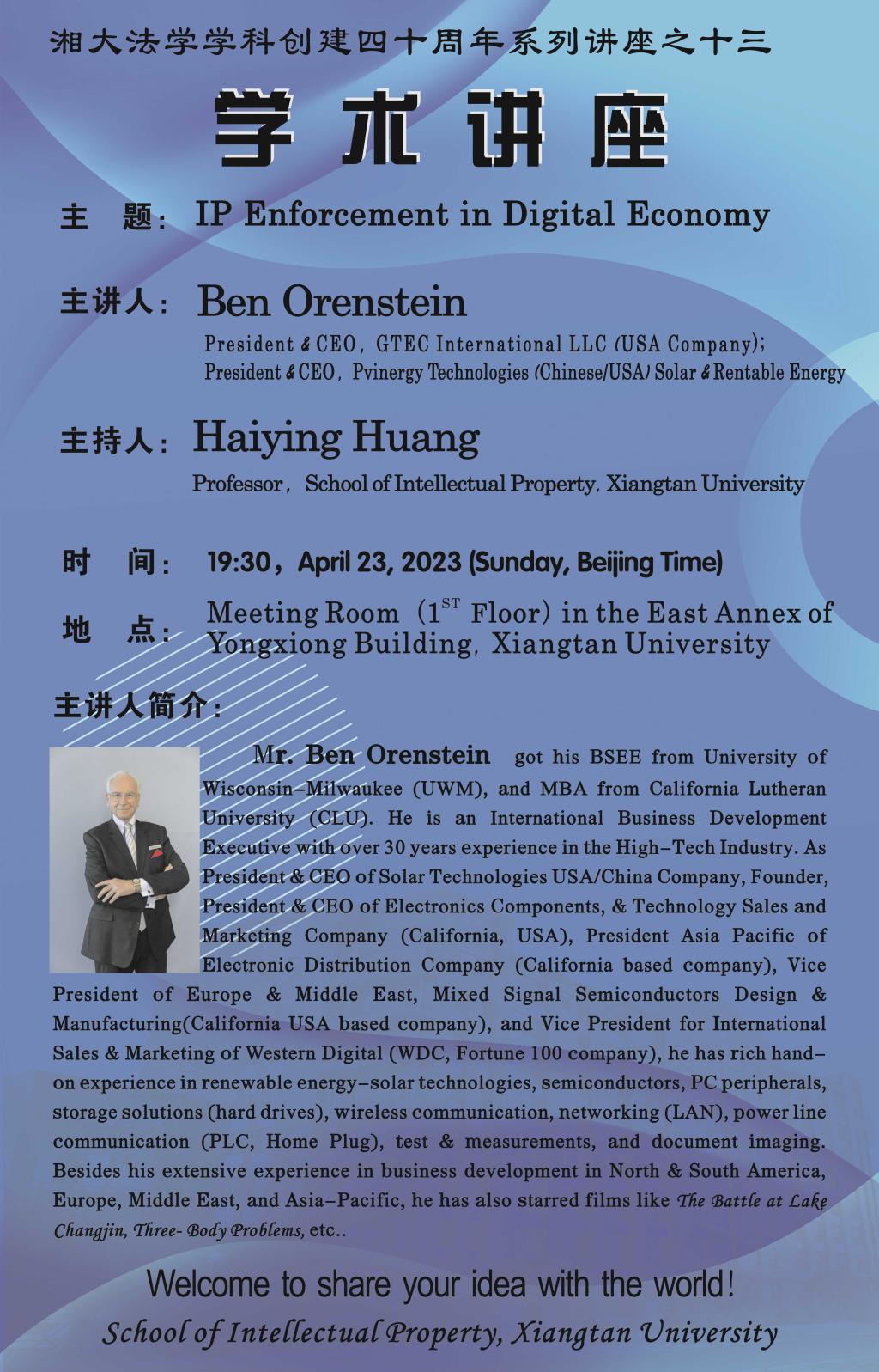 【湘大法学学科创建四十周年系列讲座之十三】Ben Z Orenstein:IP Enforcement in Digital Economy