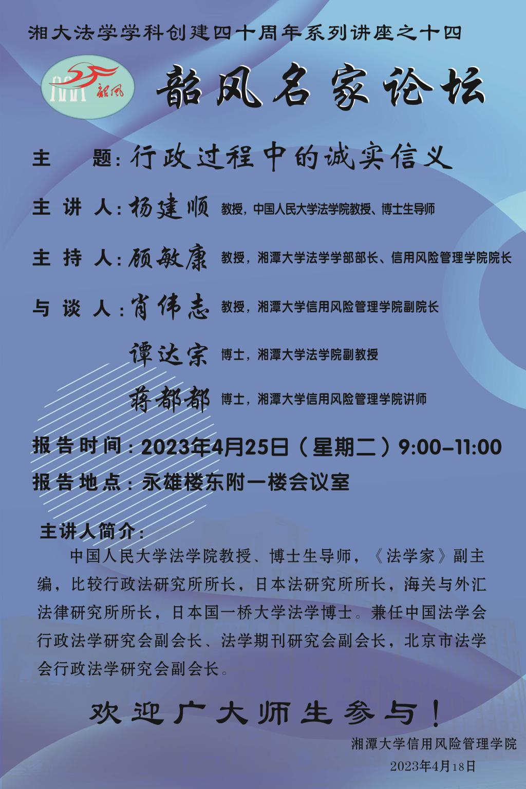 【湘大法学学科创建四十周年系列讲座之十四】杨建顺:行政过程中的诚实信义