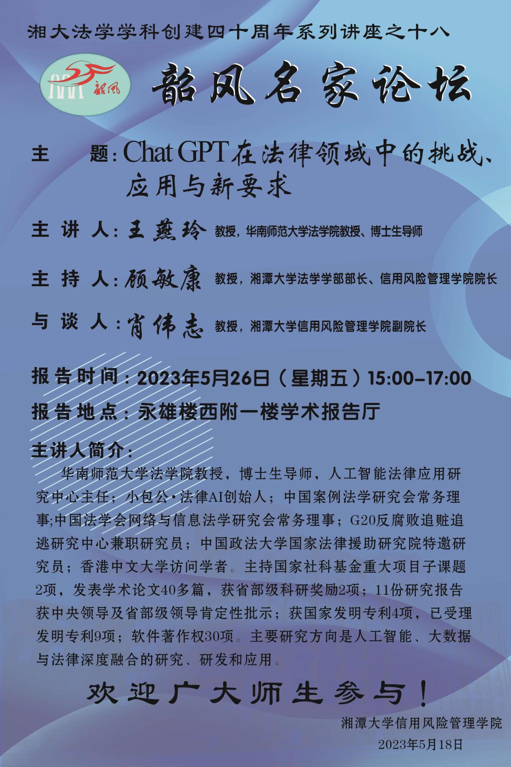 【湘大法学学科创建四十周年系列讲座之十八】王燕玲:Chat GPT在法律领域中的挑战、应用与新要求
