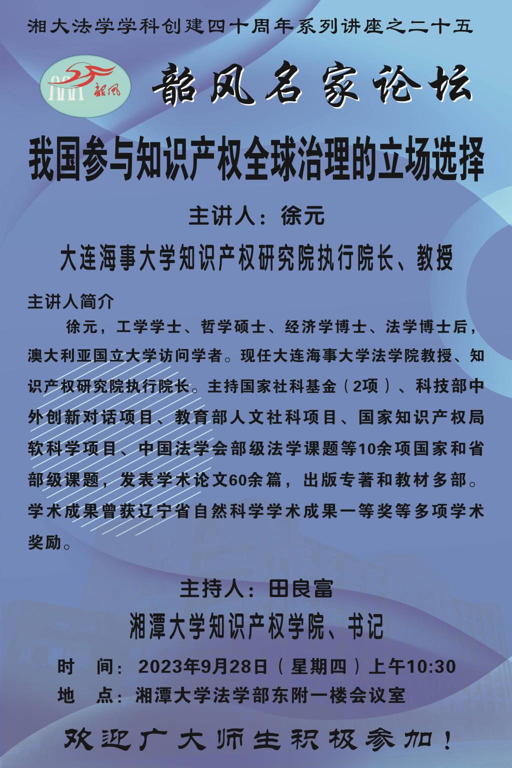 【湘大法学学科创建四十周年系列讲座之二十五】徐元:我国参与知识产权全球治理的立场选择