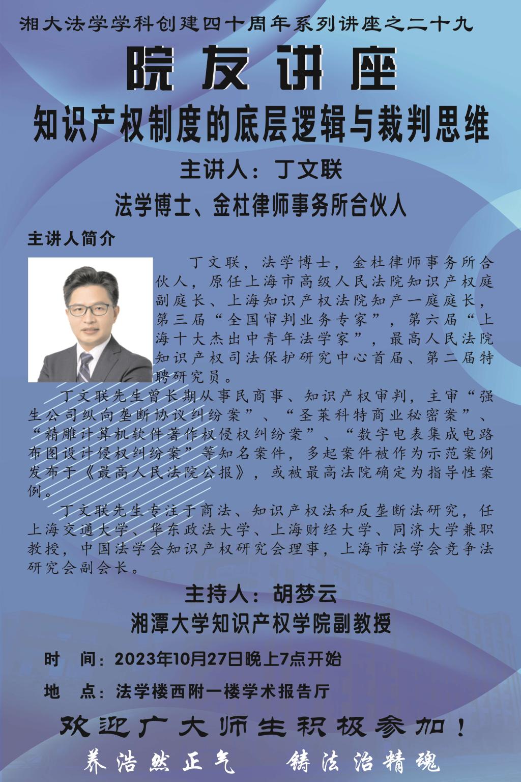 【湘大法学学科创建四十周年系列讲座之二十九】丁文联:知识产权制度的底层逻辑与裁判思维