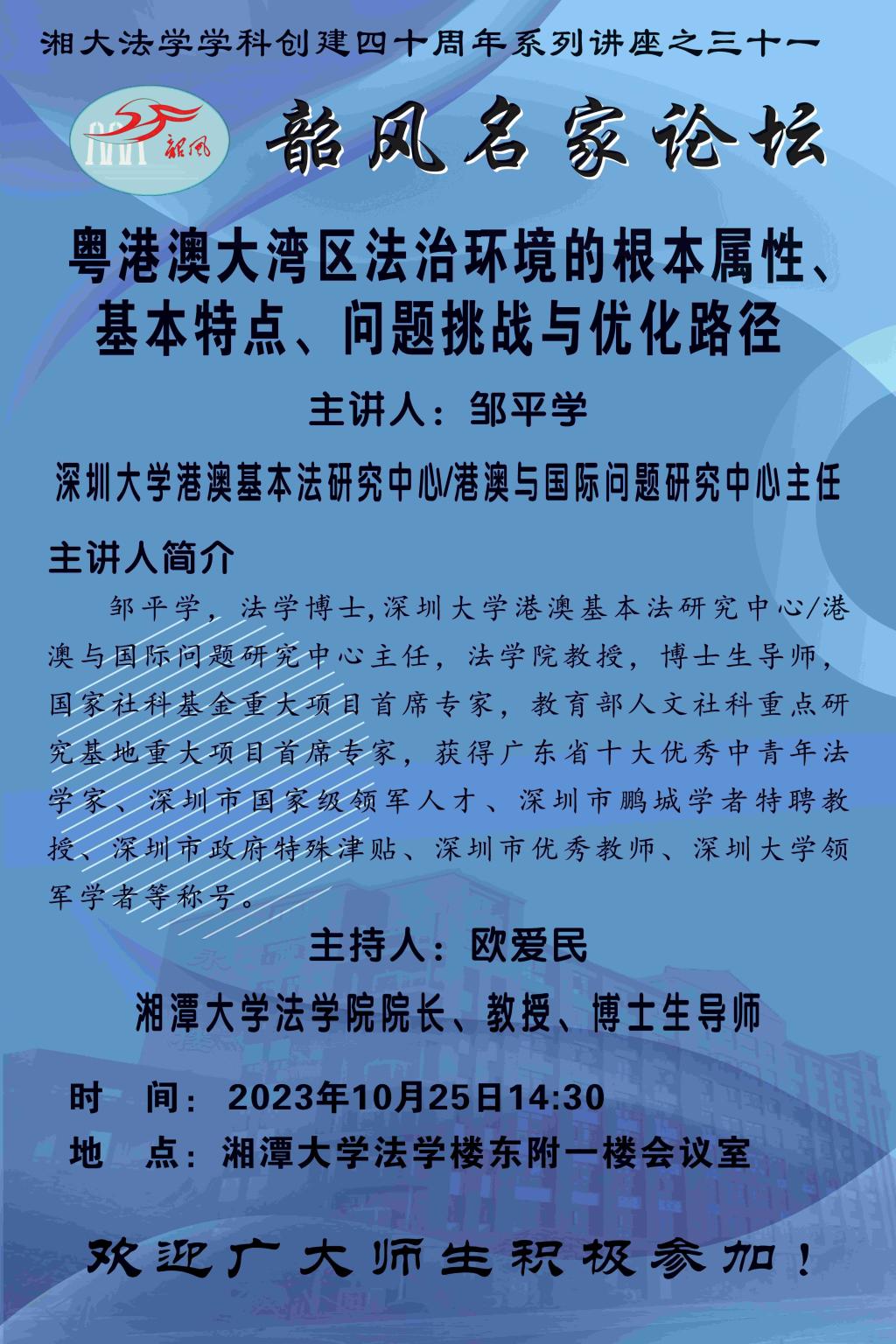 【湘大法学学科创建四十周年系列讲座之三十一】邹平学:粤港澳大湾区法治环境的根本属性、基本特点、问题挑战与优化路径
