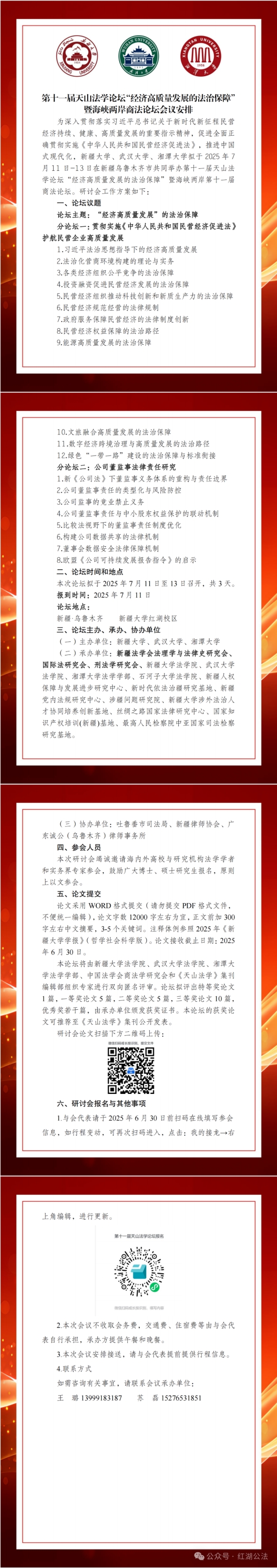 第十一届天山法学论坛“经济高质量发展的法治保障”暨海峡两岸商法论坛会议安排