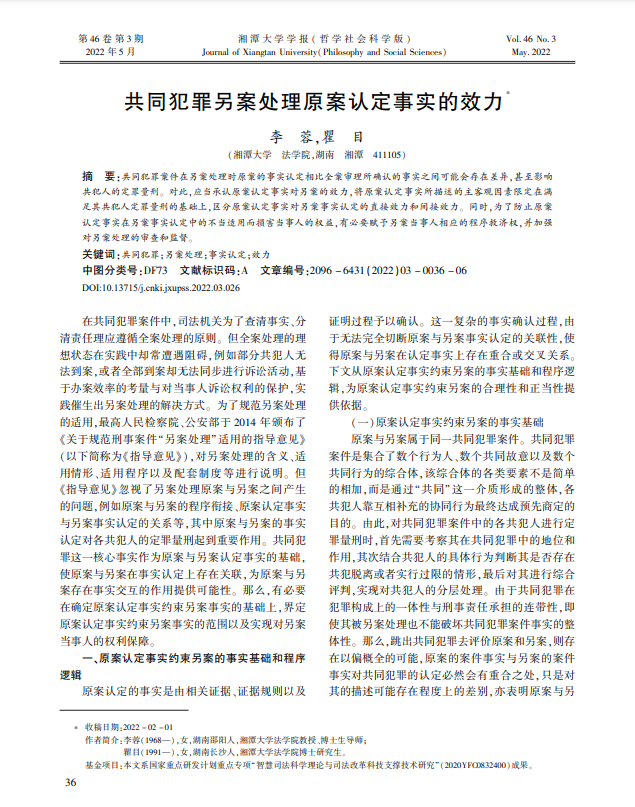 我院李蓉教授和博士研究生瞿目合著论文《共同犯罪另案处理原案认定事实的效力》刊发于