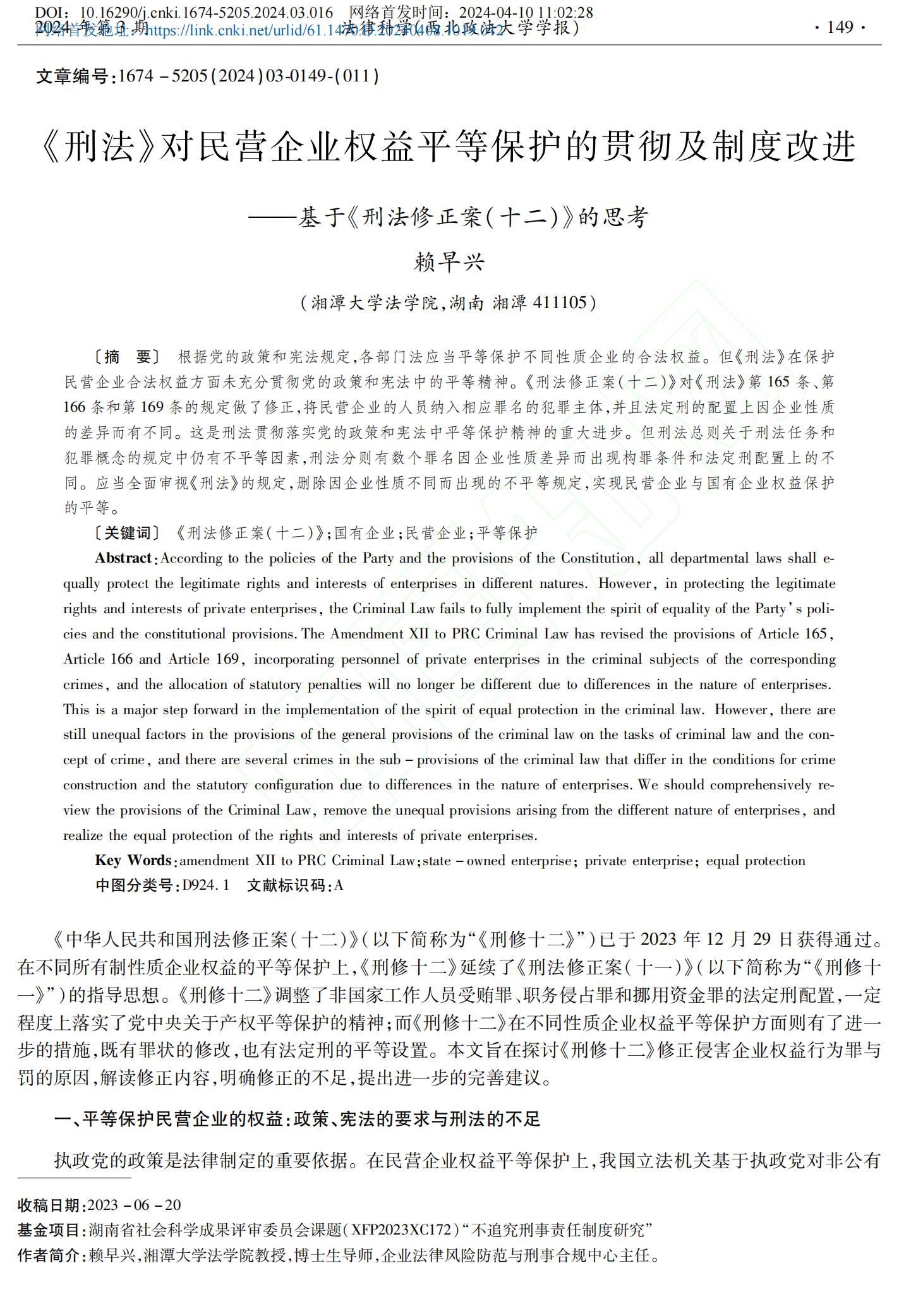 赖早兴教授的论文《<刑法>对民营企业权益平等保护的贯彻及制度改进——基于<刑法修正案(十二)>的思考》刊发