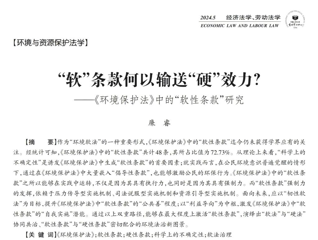 新葡萄8883官网AMG廉睿副教授的论文《“软”条款何以输送“硬”效力?——<环境保护法>中的“软性条款”研究》被人大复印报刊资料《经济法学、劳动法学》2024年第5期全文转载。