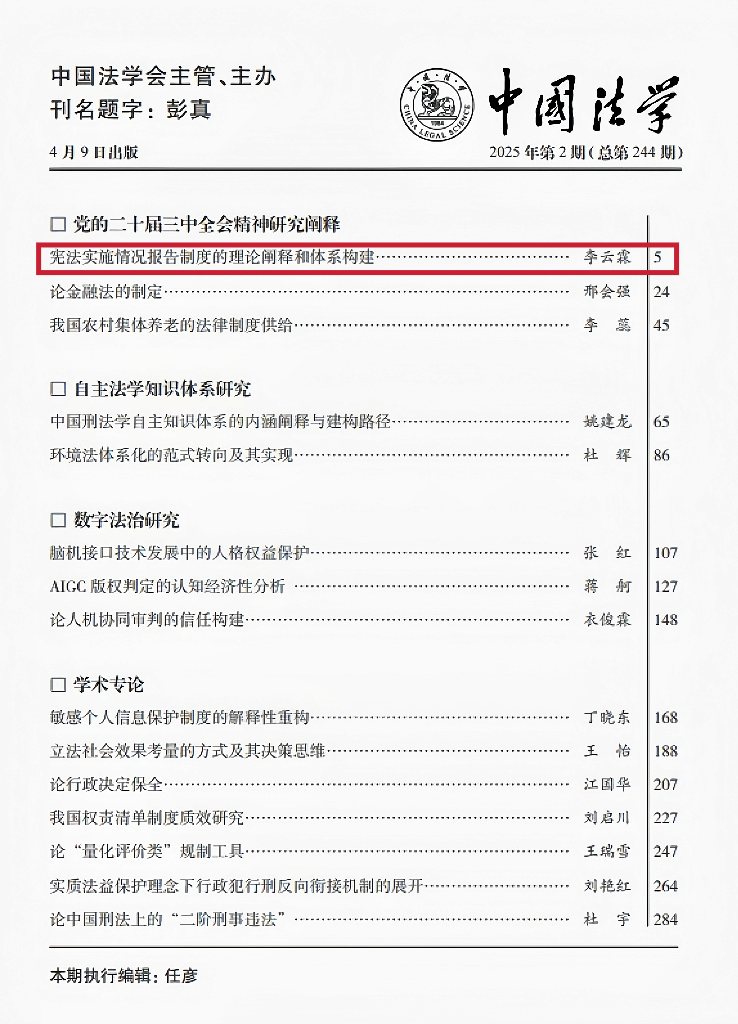 内容提要:党的二十届三中全会首次提出的“建立宪法实施情况报告制度”,是健全保证宪法全面实施的重要制度创新,是我国宪法实施和监督制度发展的重要体现。宪法实施情况报告制度立基于宪法全面实施,具有坚实的政治基础、理论基础和实践基础。在监测反馈、教育指引、制度调适等功能定位下,宪法实施情况报告制度需要秉持系统观念,从报告谱系、由谁报告、向谁报告、报告什么和如何报告等五个方面进行体系性构建。具言之,需按照以全国人大及其常委会为主体、其他国家机关参与的原则,在由宪法实施情况专项报告和以国家机关工作报告为载体的宪法实施情况报告构成的报告谱系的基础上,确定报告主体和接受报告主体,明晰报告内容及其表达等关键点,明确专项报告的时段选择、内容获取、审议发布等程序规范。