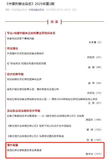 近日,学部赖早兴教授在《中国刑事法杂志》2025年第2期发表《美国犯罪记录制度改革及其借鉴》一文。