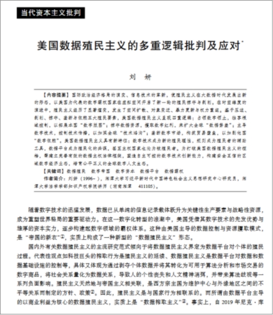 近日,我部青年教师刘妍博士的论文《美国数据殖民主义的多重逻辑批判及应对》在《马克思主义研究》2025年第4期发表。该文提出,“国际政治经济格局的演变、信息技术的革新,使殖民主义在大数据时代发展出新的形态,以美国为代表的数字霸权国家在虚拟空间开启了新一轮的殖民掠夺与剥削。在时空维度的演进中,殖民主义经历了显著嬗变,发生了空间扩散、对象变迁、暴力更新与权力重组。基于压迫、剥削、掠夺、垄断与依赖五大殖民要素,美国数据殖民主义呈现四重逻辑:占领数字领土,独享根域控制,以拓展本国“数字版图”;掠夺数据资源,攫取数字红利,来扩大全球“数据势差”;主导数字技术,控制技术传播,以加深全球“技术鸿沟”;垄断数字市场,构筑贸易壁垒,以加剧他国“数字依赖”。美国数据殖民主义具有新特征:数字技术成为新的殖民理性,规则成为殖民者的辅助工具,数据平台成为殖民化的共谋,甚至主权国家也沦为被殖民者。为打破美国数据殖民主义的桎梏,需建立完善有效的数据主权法律框架,塑造自主可控的数字技术创新能力,构建安全互信的区域数字经济业态,培育公平正义的全球数字人文生态。”