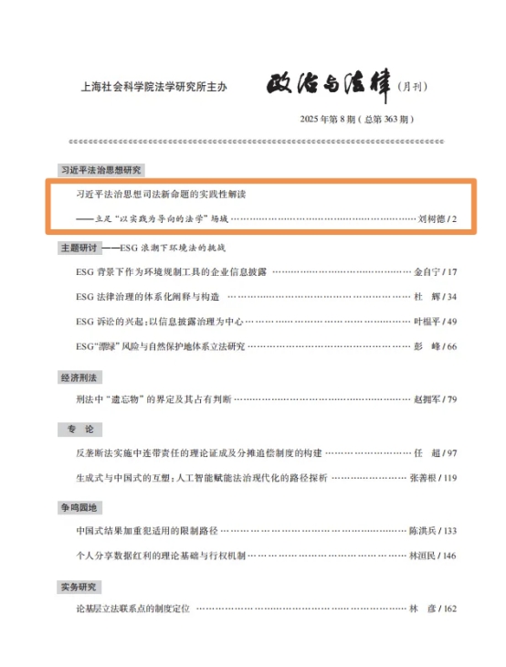 近日,我部刘树德教授在CLSCI来源期刊《政治与法律》2025年第8期发表《习近平法治思想司法新命题的实践性解读——立足“以实践为导向的法学”场域》一文。