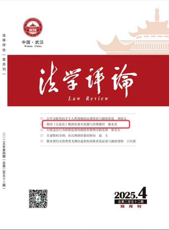 近日,我校廖永安教授在CLSCI来源期刊《法学评论》发表学术论文——《我国〈公证法〉修改的基本思路与具体路径》,原文刊载于2025年第4期,第13-27页。