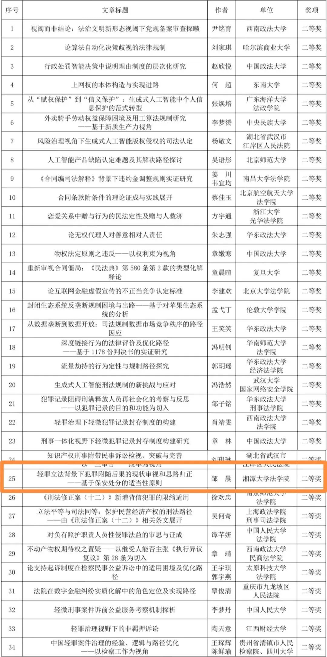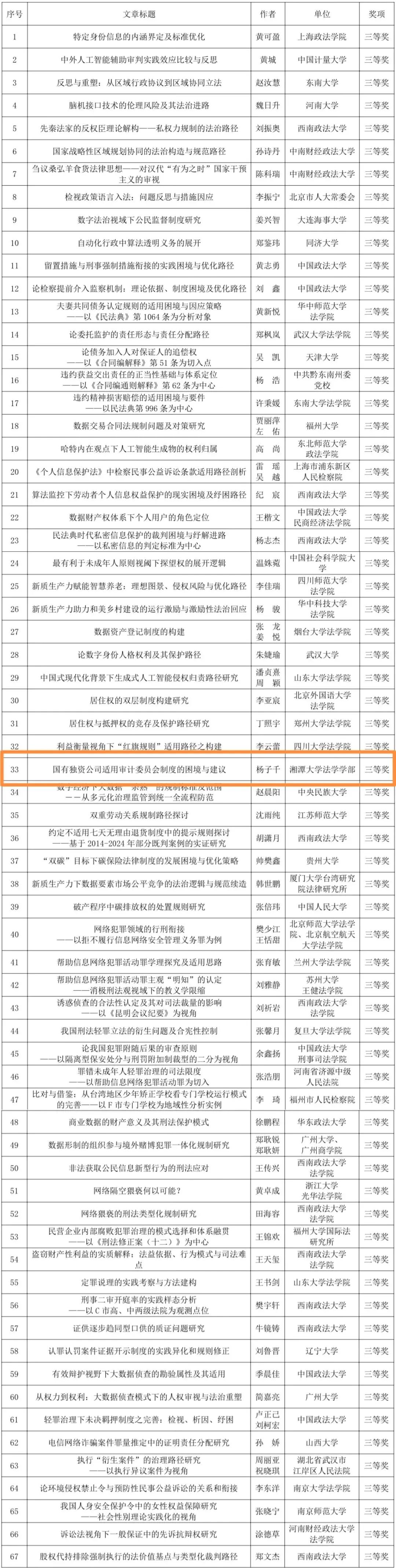 来自新葡萄8883官网AMG的邹晨凭借论文《轻罪立法背景下犯罪附随后果的现状审视和思路归正——基于保安处分的适当性原则》获得二等奖;杨子千凭借论文《国有独资公司适用审计委员会制度的困境与建议》获得三等奖。