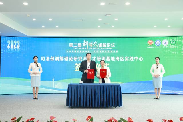 开幕式上,人民调解杂志社副总编辑孟婷婷宣读了第二届新时代调解论坛征文获奖名单,与会领导为获奖作者颁奖。本次征文共评出一等奖论文7篇、二等奖15篇、三等奖25篇、优秀奖20篇,其后举行了“司法部调解理论研究与人才培训基地湾区实践中心”签约与揭牌仪式。