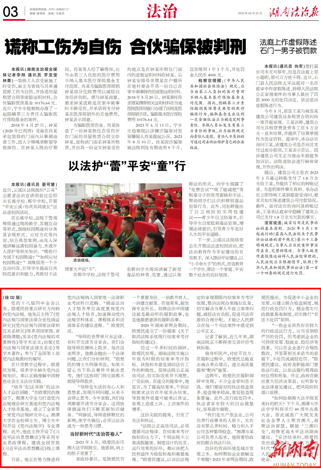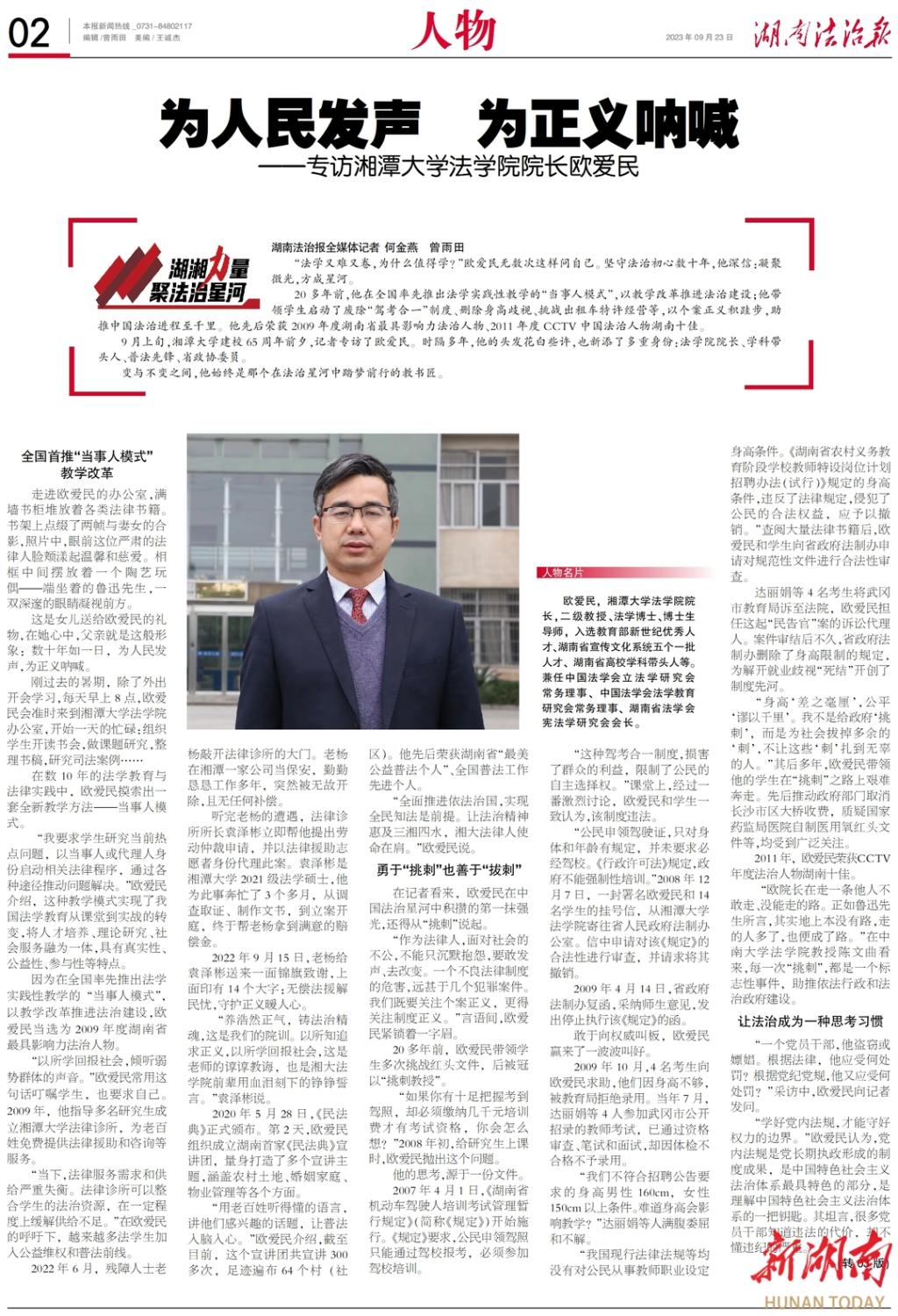 “全面推进依法治国,实现全民知法是前提。让法治精神惠及三湘四水,湘大法律人使命在肩。”欧爱民说。