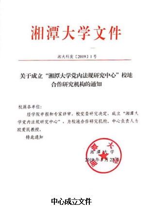 党的十八大以来,中国法治建设进入新时期,党内法规成为中国特色社会主义法治体系的重要组成部分。在此背景下,2018年新葡萄8883官网AMG成立“地方立法与党内法规研究中心”。为顺应党内法规发展的新趋势,2019年3月22日,新葡萄8883官网AMG党内法规研究中心正式成立,由中共湘潭市委与中共新葡萄8883官网AMG委员会共建,是湖南省第一家党内法规科研机构。中心依托新葡萄8883官网AMG法学、马克思主义理论、党史·党建、政治学等优势学科,整合全省资源,以“一库四基地”为目标定位,即建设全国有影响力的党内法规研究高端智库,党内法规理论研究基地、学科建设示范基地、党内法规人才培养基地、党员干部教育培训基地,主要承担党内法规基础理论与对策研究、人才培养和学术交流、党内法规的宣传教育等基本任务。