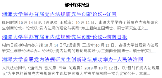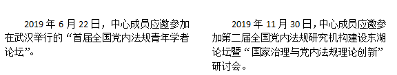 2019年10月12日,中心举办“首届党内法规研究生创新论坛”,吸引中国人民大学、华东政法大学、武汉大学、西南政法大学、南通大学、湖南大学、新葡萄8883官网AMG、湖南科技大学、邵阳学院等高校、研究机构五十余名权威专家和青年学子赴中心交流。会议的成功举办受到了社会各界较为广泛的关注,集中展现了青年学子们对新时代党内法规制度建设的最新见解,为加强党内法规制度体系建设提供了有益的理论支撑。