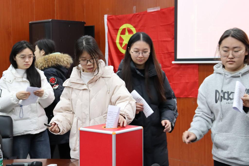 随后,按照规定流程,宣读选举办法,监票人、计票人名单以及候选人名单。全体成员严格按照选举办法对候选人进行了无记名投票,并由监票人和计票人现场进行唱票和计票。最终公布选举结果,由梁智杰担任团支部书记,刘宁担任团支部副书记,付一未担任宣传委员,陈佳誉担任组织委员,刘嘉琪担任纪律委员。