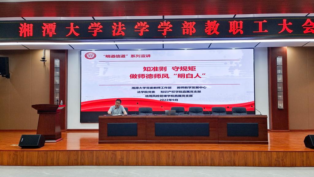 9月28日下午,新葡萄8883官网AMG“明道信道”宣讲会在法学楼学术报告厅举行。法学院党委书记陈双喜作了题为:知准则、守规矩、做师德师风“明白人”的专题讲座,新葡萄8883官网AMG全体教职工参加。