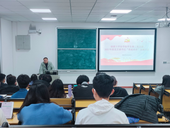 3月25日下午,中共新葡萄8883官网AMG法学院学生第二支部委员会于法学楼东附楼第四阶梯教室开展了组织生活会、民主评议、“双述双评”支部大会。会议主要回顾总结了2021年党支部党务工作开展情况,随后进行了党员民主评议、“红星导航员”中期考评等有关活动。法学院党委副书记李锋出席并讲话,法学院学生第二党支部书记江冰洁主持会议,二支部全体党员及群众代表参会。